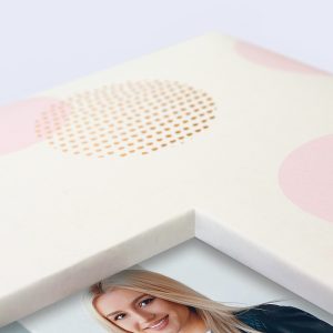 A stylish and high quality photo album with a hole for a photo on the cover.