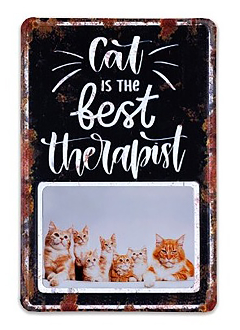 The Cat is the Best Therapist tin sign is the perfect gift and decoration for all cat people. The top of the sign features the text